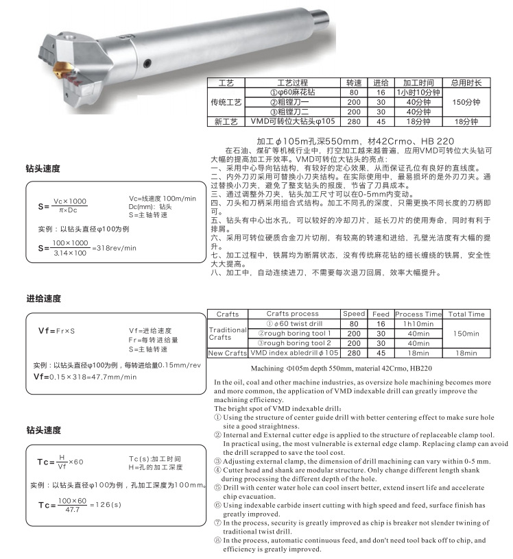 示例:加工105m孔深550mm,材质42crmo,HB 220