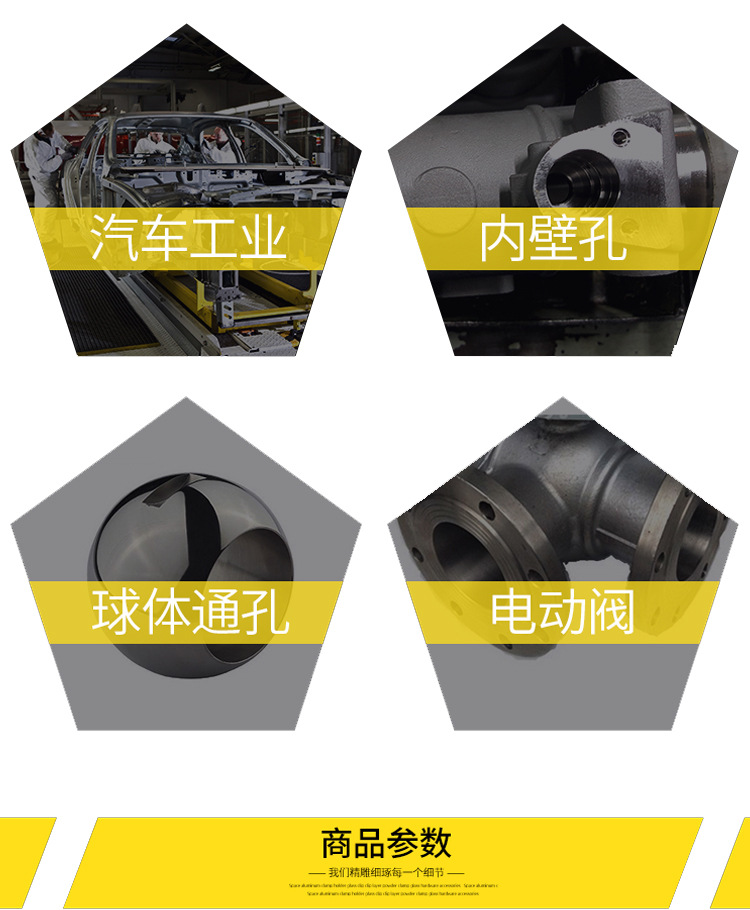不仅适用于平常机器零件的倒角,还适用于精细难倒角零件的倒角和去毛刺,例如:航空,军事,汽车工业零件,电动阀,引擎缸体,气缸,通孔,内壁孔。
